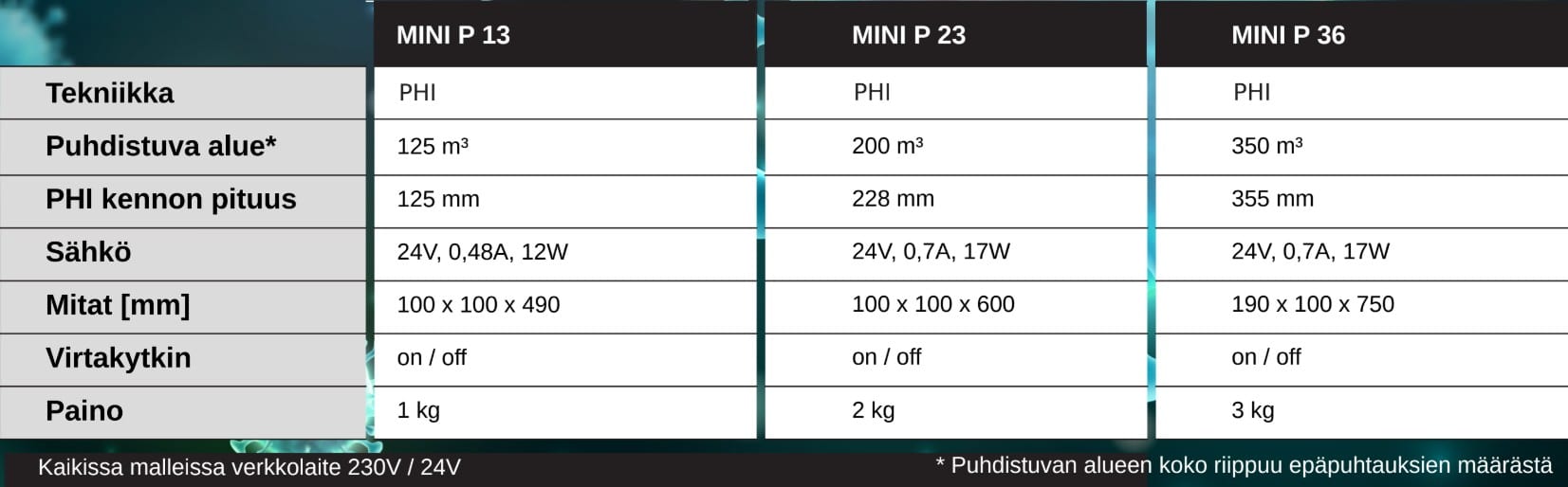 Hengitä puhtaampaa ja raikkaampaa ilmaa! CLEAN AIR MINI P 13 -ilmanpuhdistin hyödyntää edistyksellistä PHI-tekniikkaa ja LED-ionisaatiota, jotka vähentävät tehokkaasti homeitiöitä, bakteereita, viruksia, pölyä ja epämiellyttäviä hajuja. Tämä ilmanpuhdistin ei pelkästään poista tunkkaista ilmaa, vaan auttaa myös parantamaan sisäilman laatua ilman otsonia tai haitallisia jäämiä.